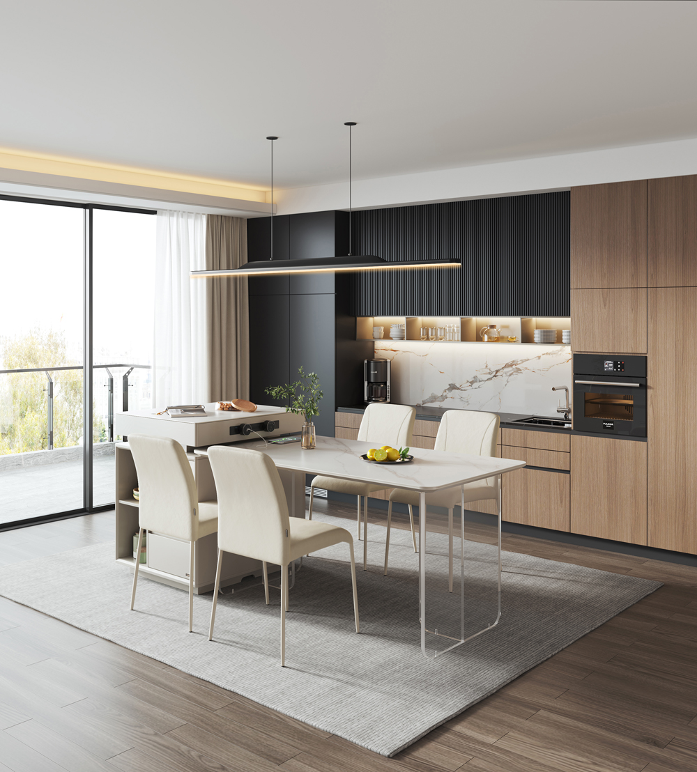 轻智能餐桌岛台组合更省心,多功能岛台“悬浮”餐桌采用岩板台面搭配亚克力板桌腿,通透明亮,质感拉满。多功能岛台安装了可移动滑轨充电插口,手机、小家电皆能满足,用电不用再受限制。