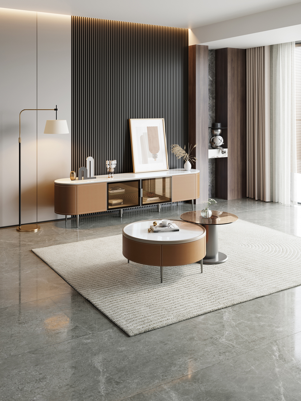 艺术感十足的茶几电视柜组合产品,刚柔并济,时尚有质感。组合式茶几高低错落,可根据需求组合搭配,前后宽敞大抽屉,收纳更多零碎物品。电视柜采用铝框玻璃柜门,时尚优雅有序收纳;内置智能感应灯,夜间取物一目了然。