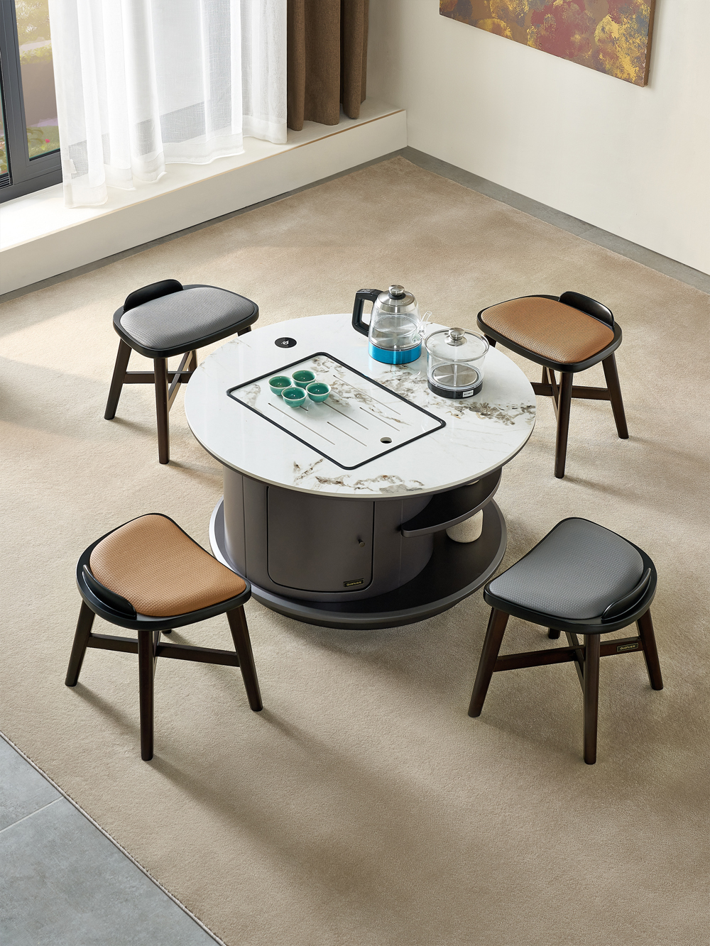 现在越来越多的年轻人也喜欢以茶会友,新式智能茶桌无疑是个不错的选择,自带一体式泡茶系统,一键极速烧水,操作简单方便,桌面还内嵌了智能无线充电位,随手一放即可充电。