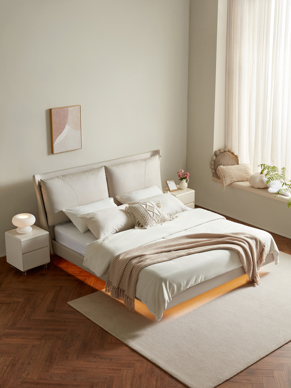 “悬浮”软床采用宽大靠包+双层设计,柔软承托住腰背,享受到被包裹的安全感;底部安装环绕式智能感应灯带,人体感应靠近即亮,柔和光线让夜晚更安心。