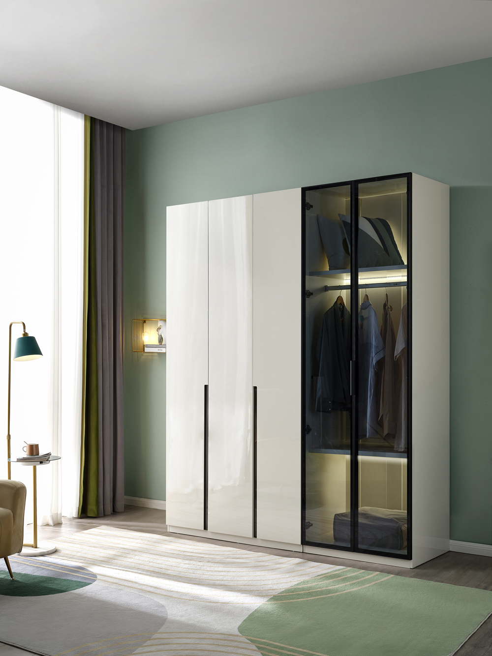 多功能衣柜内部人性化分区,搭配感应式LED挂衣杆,寻找衣物无需开灯;玻璃柜门方便可视化收纳,一目了然可快速拿取衣物,空间通透不显凌乱。