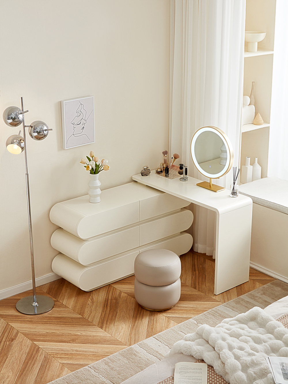 奶油配色+波浪线条打造的法式梳妆台灵动柔和,它的可伸缩设计可以满足不同空间摆放需求;梳妆镜还内置了LED灯,3种光效智能调光,轻触即可开关,实用性拉满。
