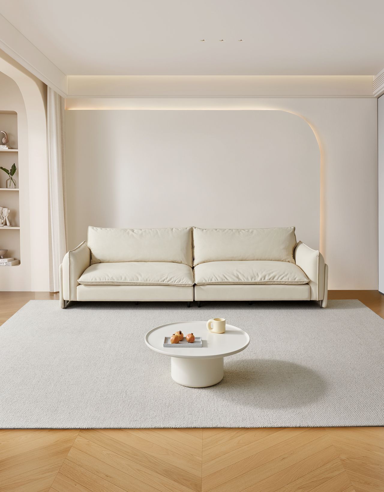 麦云沙发以Magellanic clouds·麦哲伦星云为设计灵感,亚克力沙发脚搭配柔光灯带,如悬浮于太空,视觉轻盈。将蓬松羽绒填充座靠扶手,触感柔软。65cm大坐深,包容百变姿势,坐躺不拘束。细腻生态科技皮材质,柔韧亲肤,经久耐用。