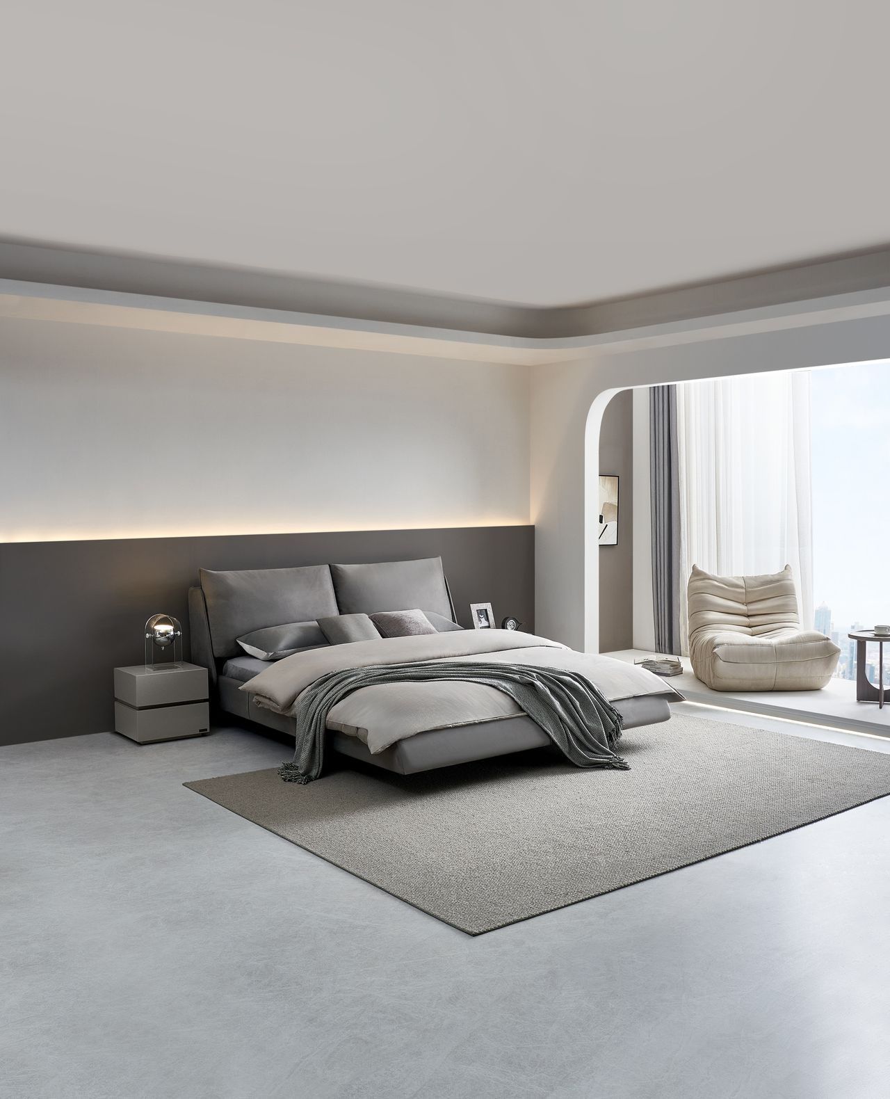 巴斯软床以巴斯彗星为设计灵感,外观采用标志性的彗星尾设计,新颖别致。悬浮设计搭配智能感应灯带,营造星际太空的光影氛围,一眼望去如腾空悬浮。深空灰磨砂绒布耐磨透气,分体式大靠包内填微孔式弹棉,蓬松弹软、轻松躺靠,释放压力。
