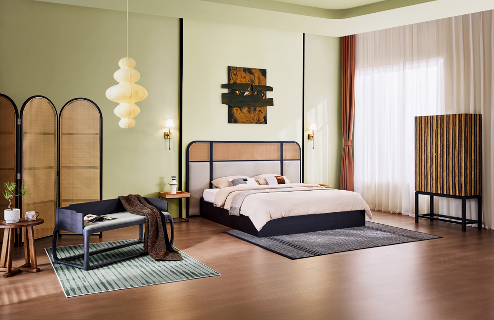 步入卧室,打开透着日光的竹编屏风,罗汉椅、软床、装饰柜依次出现,传递出超越时空的美感。