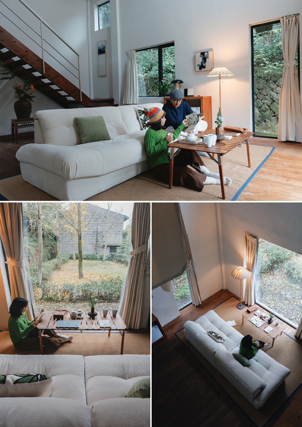 从都市白领转身为山中村民,他们的人生仿若按下重启键。在山林之中办公生活,通勤的烦恼消散于无形,生活的美好尽在眼前。超大落地窗前的伊莉讨论区 沙发,成为了民宿里专属的舒适角落,躺在上面办公,闲暇时悠然休憩,消磨整日也不会觉得浪费。窗下有清风,耳畔有蝉鸣,目之是旷野,身后是山林,这便是@阿biu和二佳 在莫干山的旅居生活。