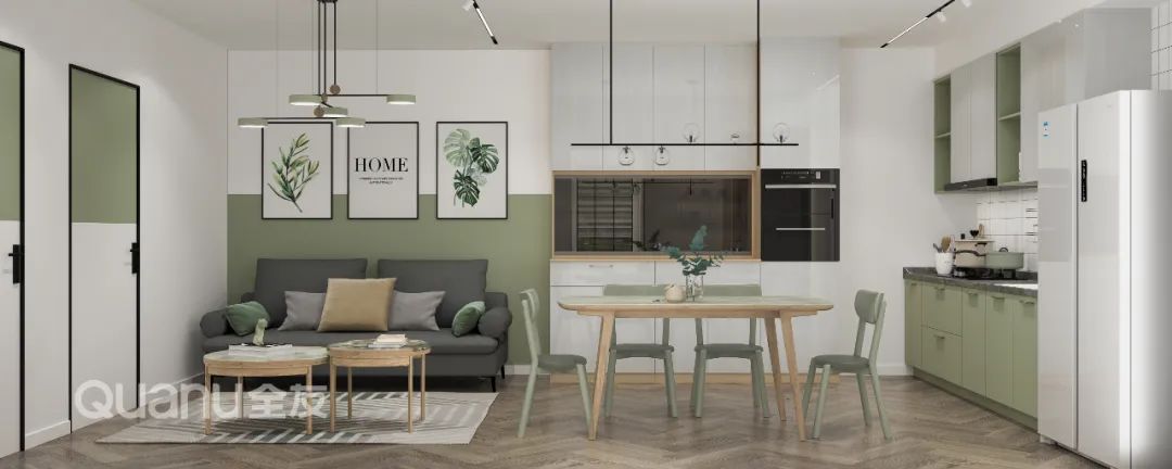现在的年轻人大多没有看电视的需求,除了将电视柜改造为整墙储物柜以外,还可以把“沙发+茶几”的组合改为“岛台+长桌”。这样设计不仅可以满足烘焙的乐趣,偶有社交需求也不用担心没有待客的地方,喜欢喝茶的人,还可以将长桌作为茶桌使用,客厅功能更加多元,实用性更强。