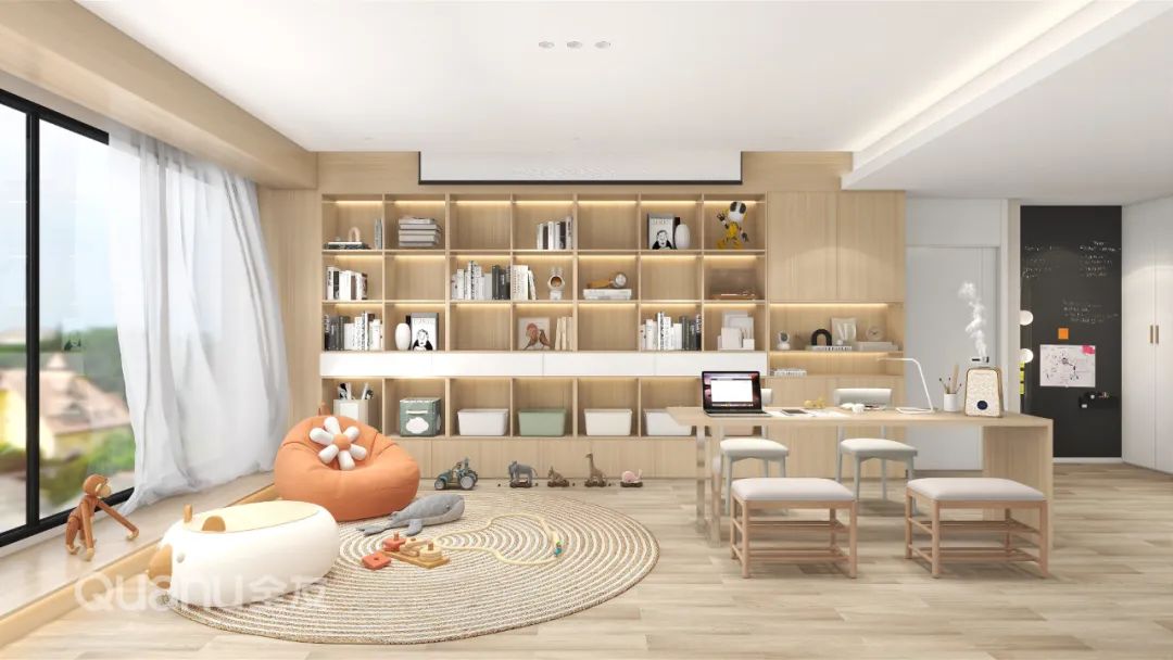 将客厅打造为一个温馨的亲子互动区也是不错的选择。学龄前的孩子,需要的是无障碍的活动空间,客厅可以减少家具的摆放,留出更多空间给孩子玩耍。同时利用整墙储物柜,对孩子的玩具、书籍进行收纳,还能培养孩子的动手能力与创造力。有需要的还可以在客厅摆放书桌椅,方便父母在一旁陪伴监管,有助于增进父母与孩子间的亲子关系,孩子长大以后也能在这里写写作业,和父母一起做做手工。